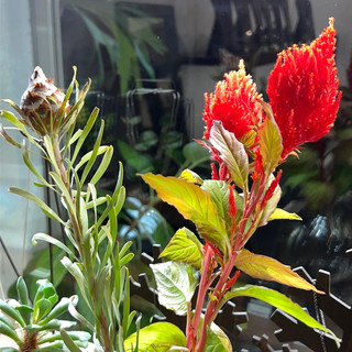 赤いのがケイトウ、大きなつぼみがプルモサスという植物です。